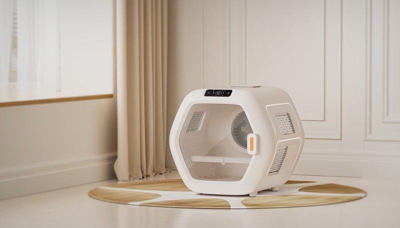 Start by using their favorite treats to gently lure them inside the dryer (keep the door open at first!). Let them sniff around, take the treat, and step out freely—this helps them link the dryer to something positive, building that "muscle memory" of it being a safe space.For the first 2-3 uses, stay right beside the dryer while it’s on. Talk to your pet in a calm, reassuring tone, and if they seem uneasy, pause to give them another treat or a quick pet. Your presence will help them feel secure as they get used to the gentle wind and mild sound.Once you notice your pet walking into the dryer voluntarily (without needing treats) or staying relaxed during the cycle, you can slowly transition to more convenience: use the app to set the drying mode and time, and let them enjoy the cozy experience on their own. Many pet parents find their furry friends even start napping a little inside once they’re fully comfortable!